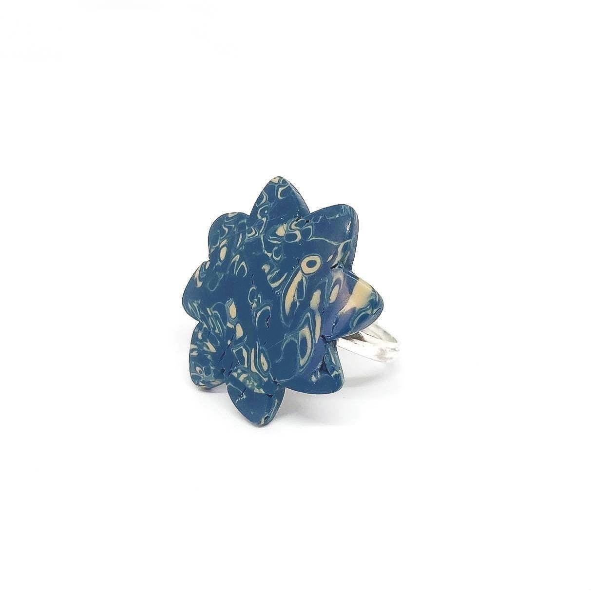 This unique flower ring is handmade with blue and tan polymer clay and an adjustable silver plated base.