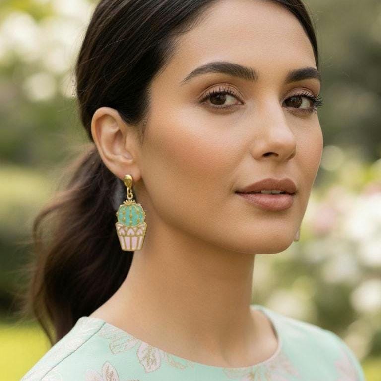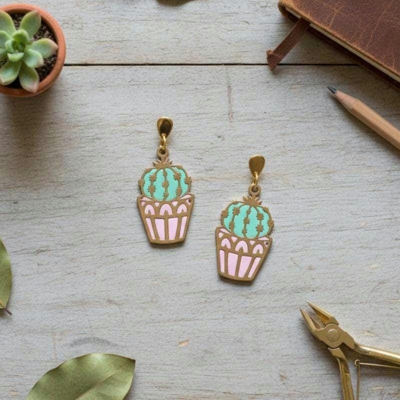 Handmade cactus earrings featuring gold stainless steel cactus charms with hand-applied polymer clay.