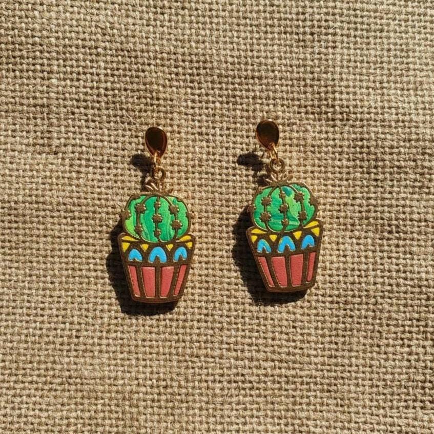 Handmade cactus earrings featuring gold stainless steel cactus charms with hand-applied polymer clay.