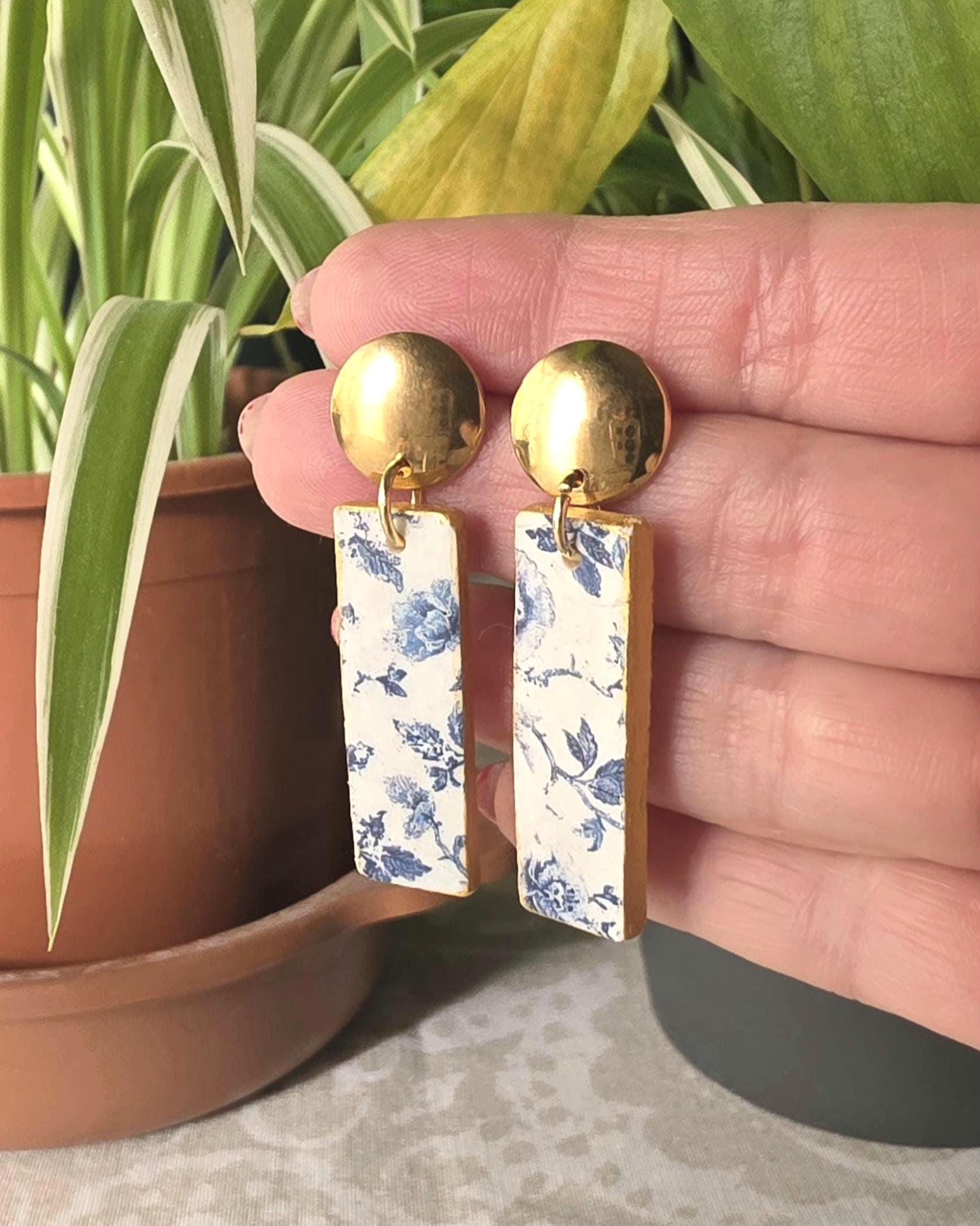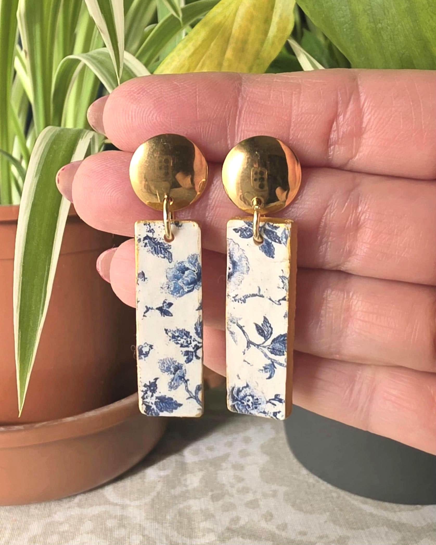 Handmade polymer clay earrings with a delicate blue and white floral pattern — the kind of piece that looks like it came from a vintage porcelain collection.