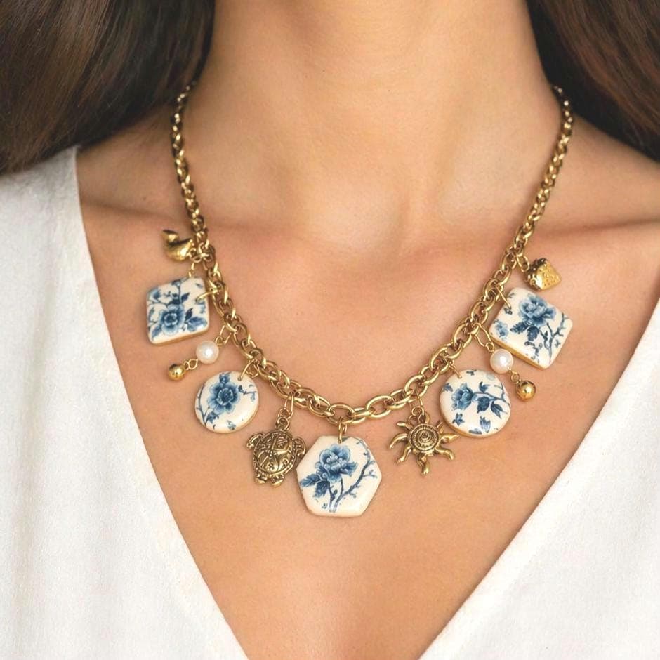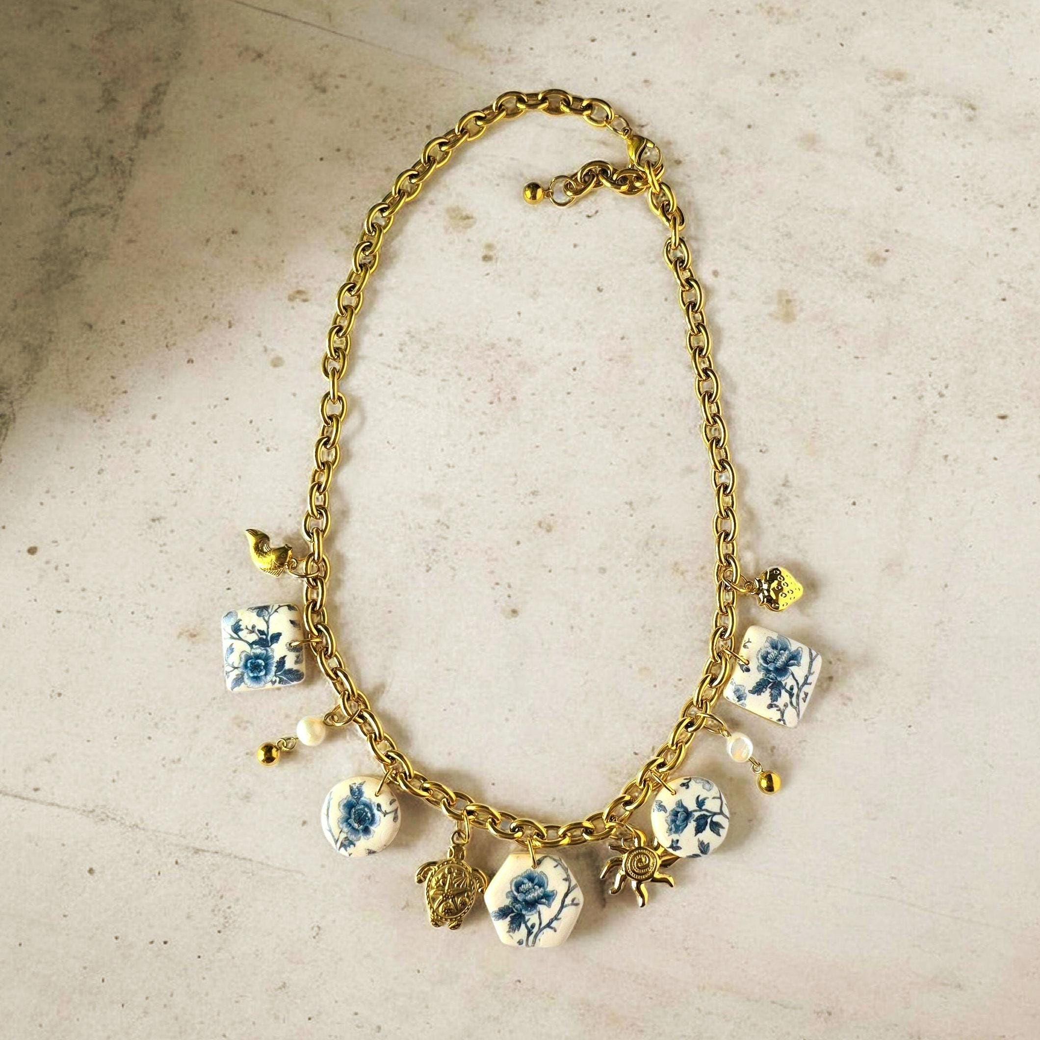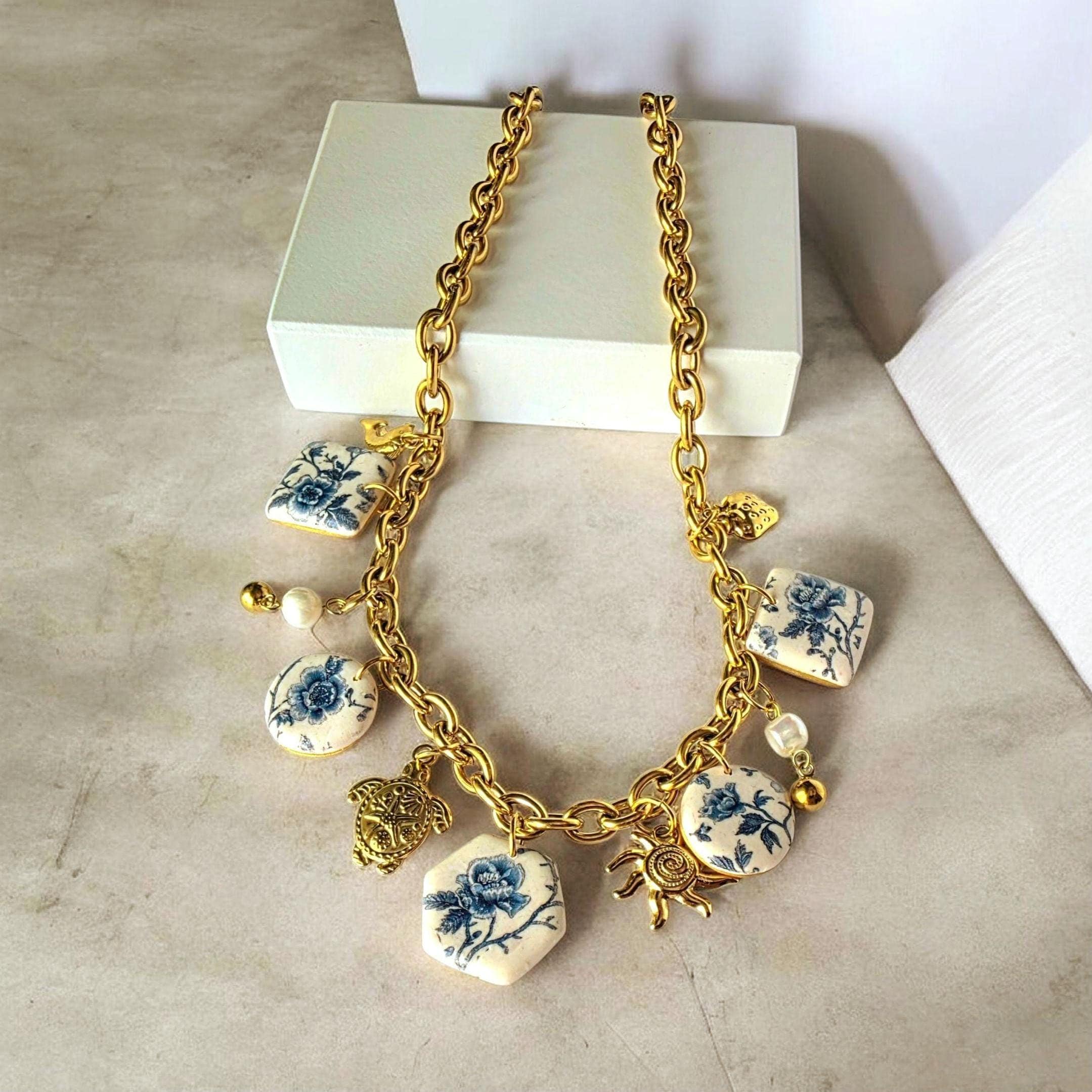 A one-of-a-kind handmade charm necklace featuring blue floral polymer clay charms on a gold belcher chain. Each clay charm is carefully sanded, polished, and varnished by hand for a smooth, lasting finish — mixed with gold stainless steel charms and pearl accents for an eclectic, collector-worthy look.